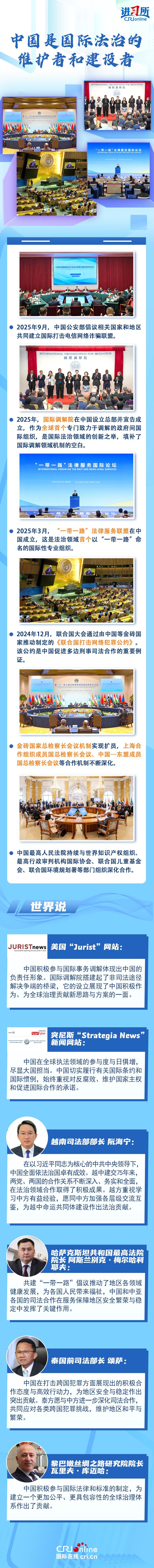 “通过良好的国际法推动全球良好治理,助力构建人类命运共同体。”作为国际法治的捍卫者和建设者、全球治理的参与者和推动者,中国积极参与联合国框架内国际规范制定,积极推动完善国际争端解决机制,推动国际关系法治化。国际社会普遍认为,中国积极参与国际法和标准制定,展现了大国责任为建立更加公正、包容的全球治理体系作出了贡献。