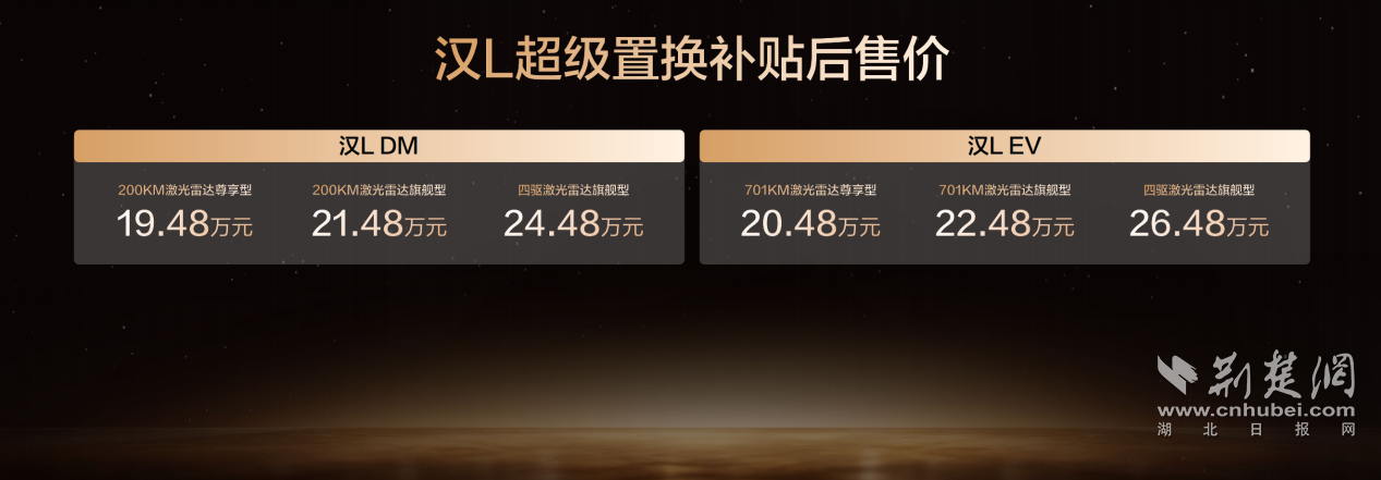 此次,汉L EV共推出三款车型,补贴后售价为20.48万元至26.48万元。汉L DM 3车型,补贴后售价为19.48万元至24.48万元。同时,比亚迪还准备了价值高达5.2万元的限量福利,其中包括外援改变对用户的补贴。 (之前的权利有效期至12月31日)