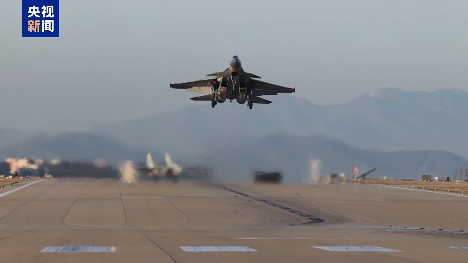 一大早,多架歼15战斗机在空管员的命令下陆续起飞,组成战术编队,冲向训练空域,在红蓝的天空下进行作战训练。